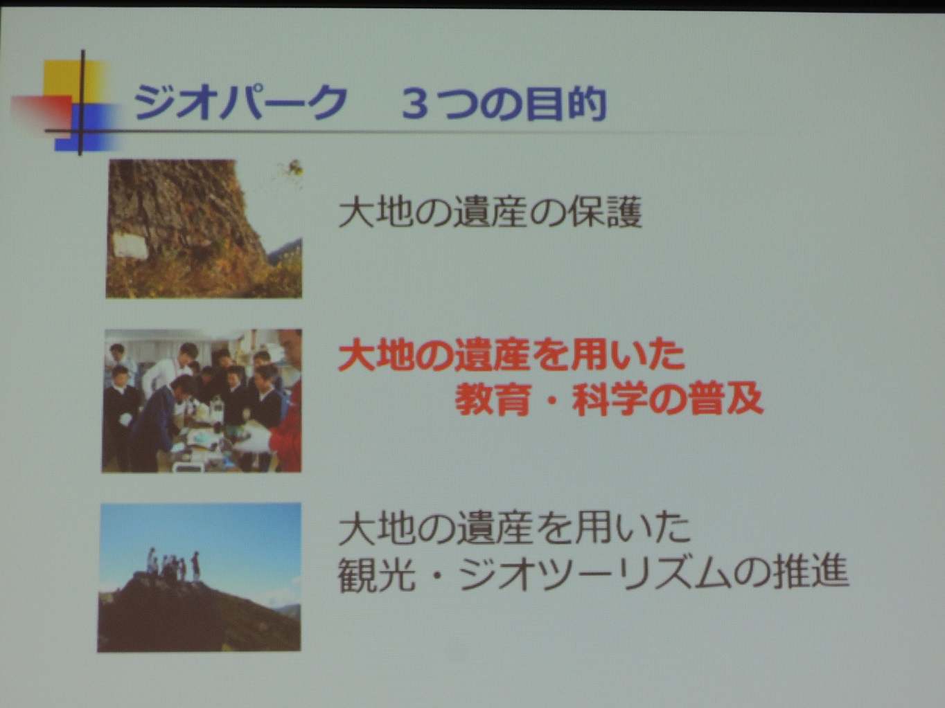 青木さんは、ジオパークの目的に「大地の遺産を用いた教育・科学の普及」があり、そのジオパークを通して、自らの地域を学び、考えることで、地域の「個性」に気づき、他の地域を相対化し理解することにつながる。つまり足元の環境の理解から、グローバルな環境理解へとつながると指摘されました。そのことで「どこにでもある街」「普通の街」は全国どこにもなく、むしろ自分の地域に自信をもつことで、「地域アイデンティティ」の確立がなされる。地域の立ち位置が分かれば、あるべき姿、地域の未来が見通せるようになる、と提言されました。